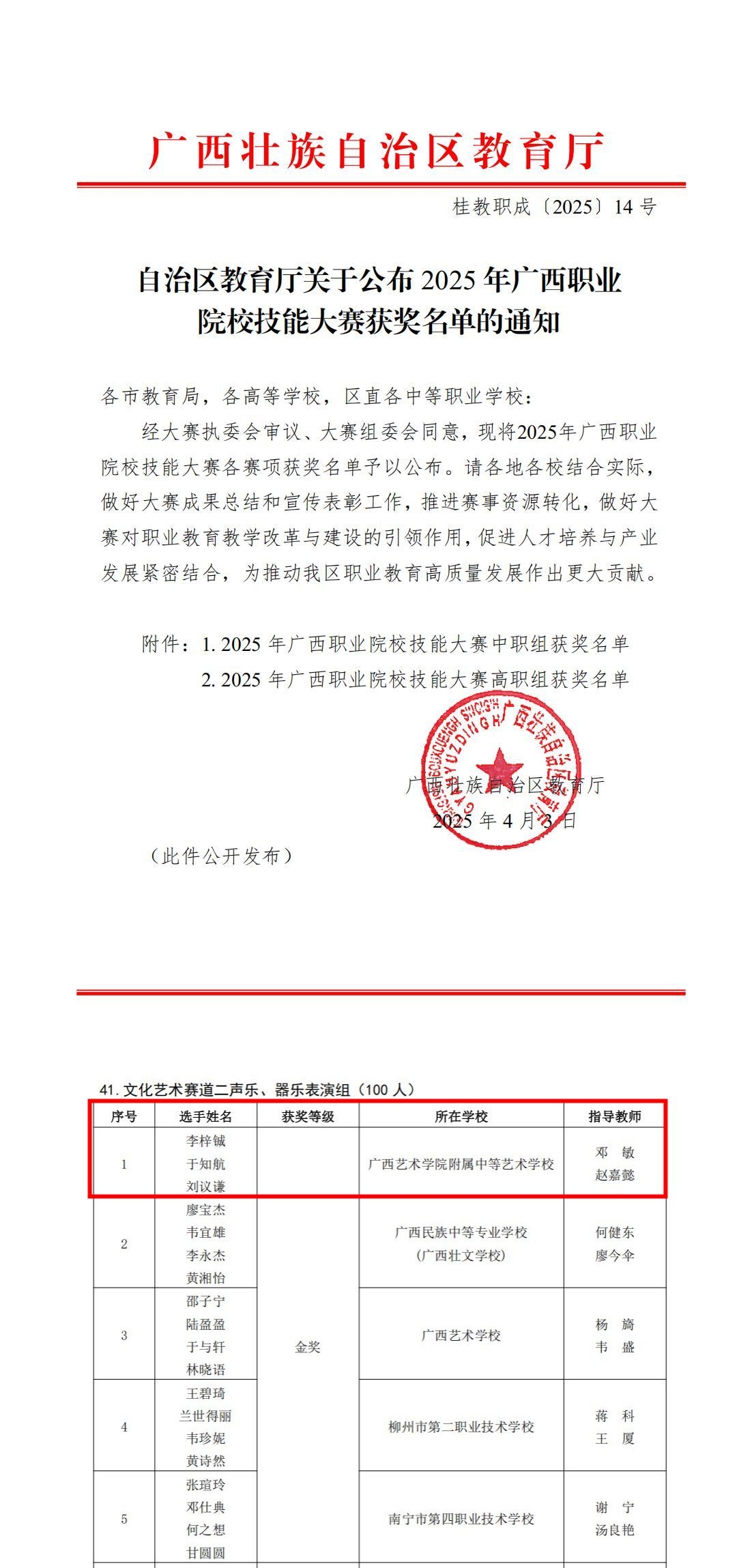 近日,由广西壮族自治区教育厅主办的 2025 年广西职业院校技能大赛中职组文化艺术赛道二《声乐、器乐表演》赛项圆满落幕,附校代表队凭借卓越表现,以总分第一的佳绩斩获金奖第一名。